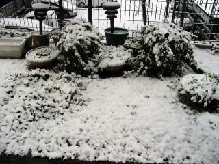 この冬は寒いですね、こんなふうに庭にうっすら雪が