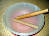 パン作り用のタッパーを臼に、麺棒を杵にして