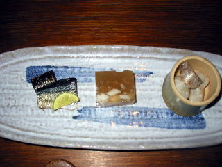 前菜は太刀魚の柚庵焼き 白身魚の煮こごり 牛蒡の胡麻味噌あえでした。