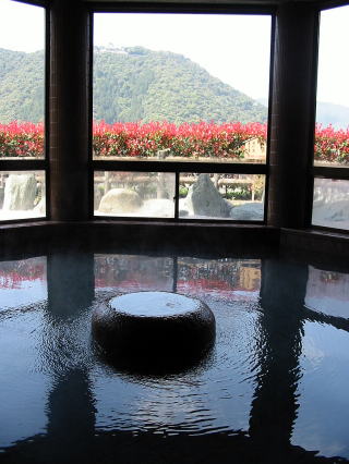 このお風呂、この日のこの時間は 私一人しかお風呂に入っている人がなく 貸し切り風呂でした。 戸外に露天風呂もあり お風呂からは岩国城が遠くに見えて 絶景なのです☆