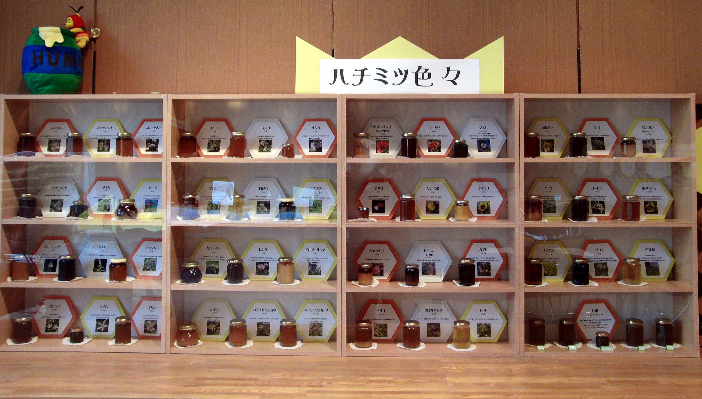 ↓この展示でもたくさんの種類の蜂蜜があり