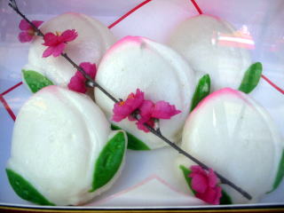 季節柄「桃饅頭」→がお菓子屋さんの店頭に