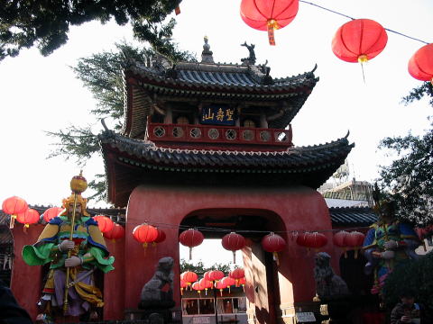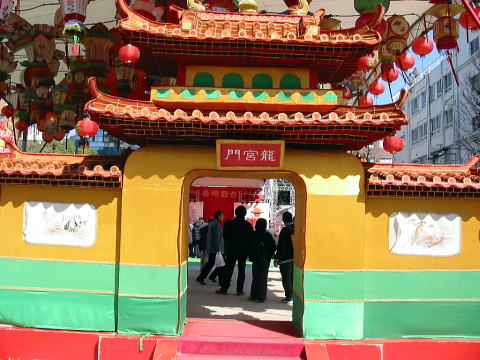 赤い竜宮門から階段の上までランタンが並んでいます。