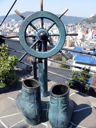 亀山社中設立130年を祝って作られたブロンズの龍馬のブーツ像、実際にこのブーツを履いて